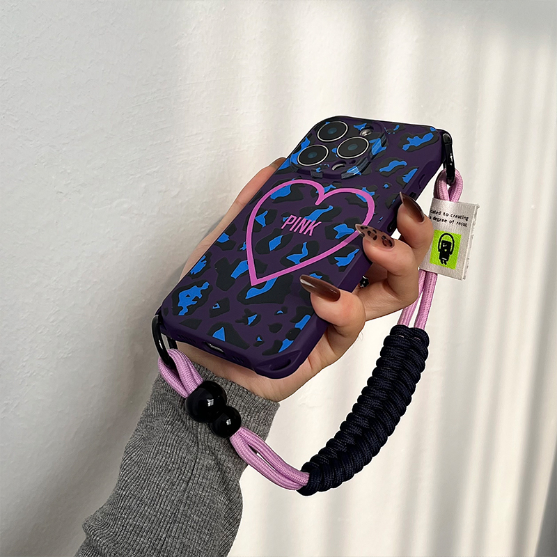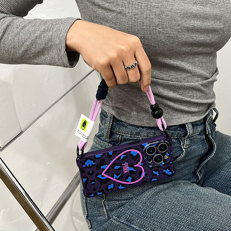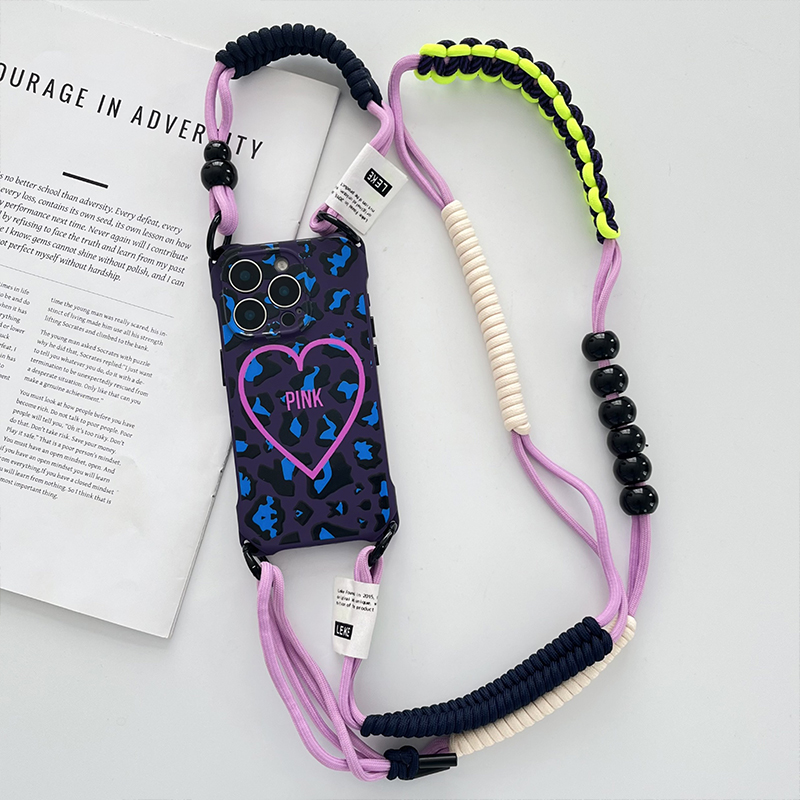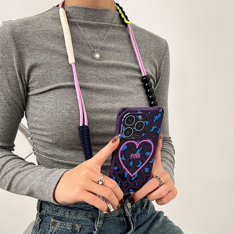 Pink豹纹莫奈紫爱心16promax手机壳适用华为mate70pro重工编织挂绳调节背带斜跨vivox200手提小米15斜挎可背