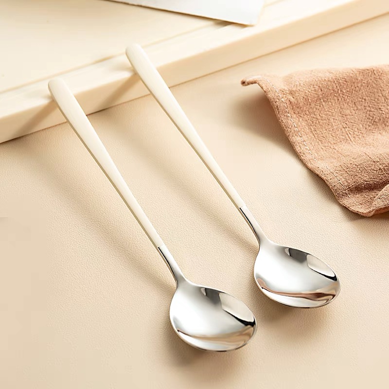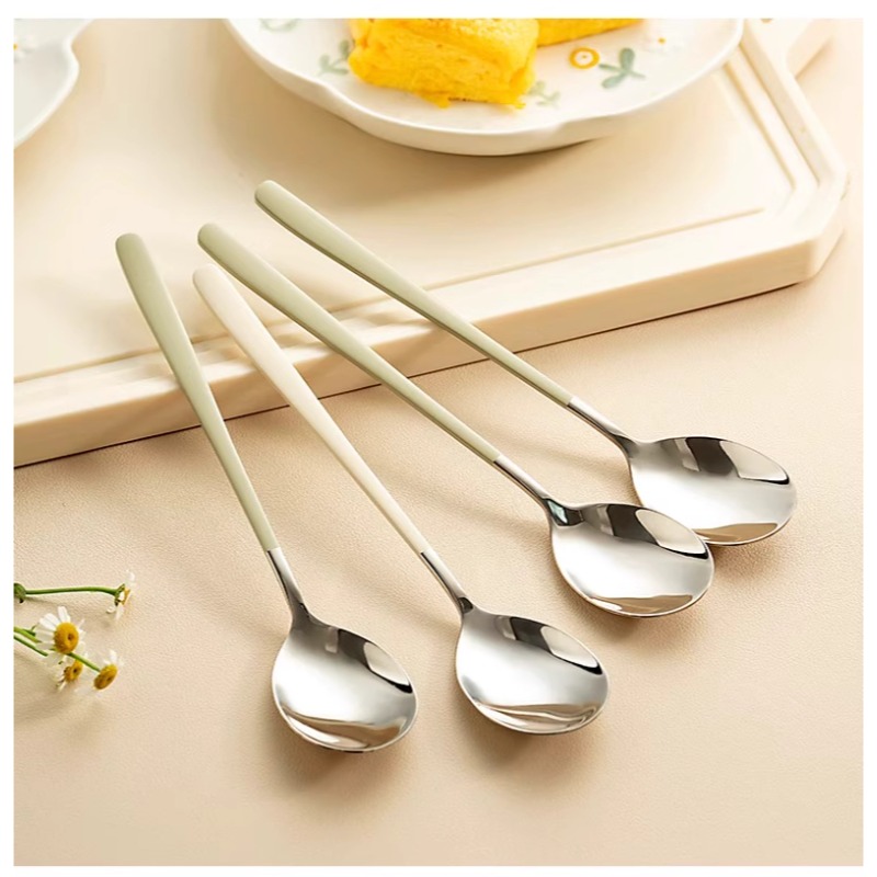 奶白色304不锈钢勺子高颜值牛油果色韩式家用ins长柄喝汤西瓜