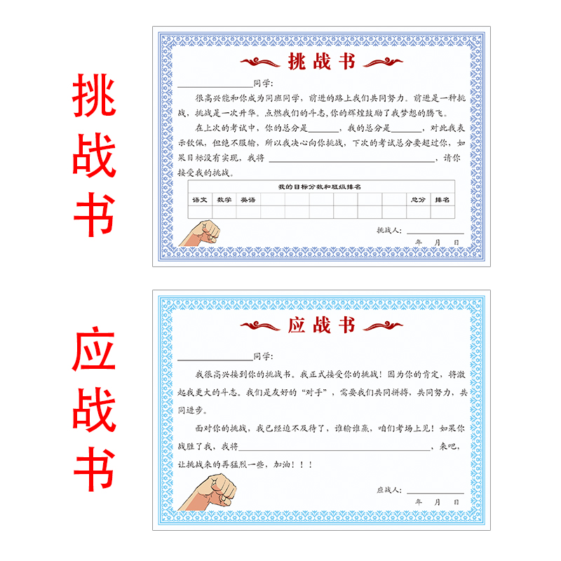 挑战书应战书小学生中学生向同学发出挑战共同进步提高学习成绩挑战书
