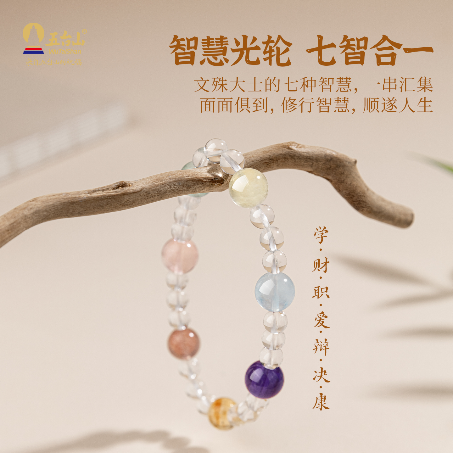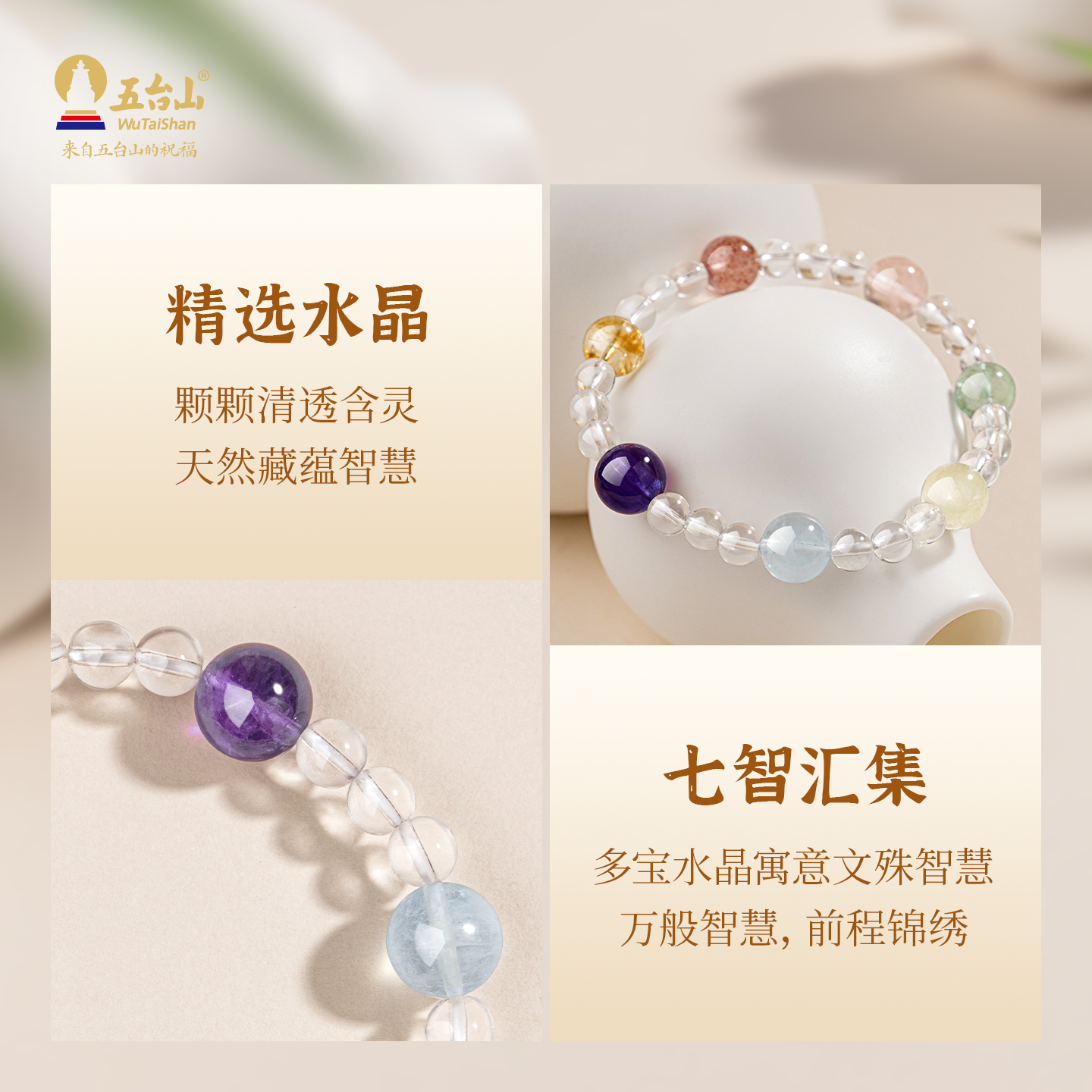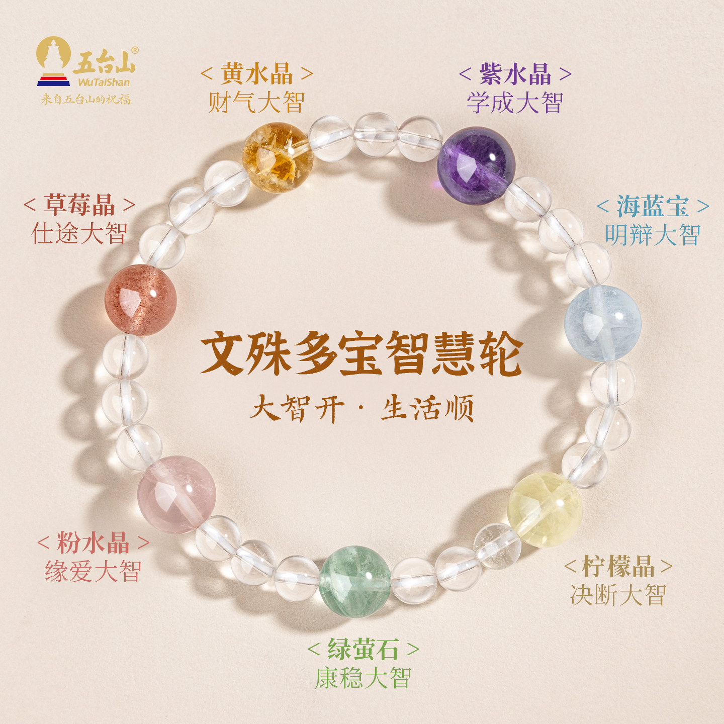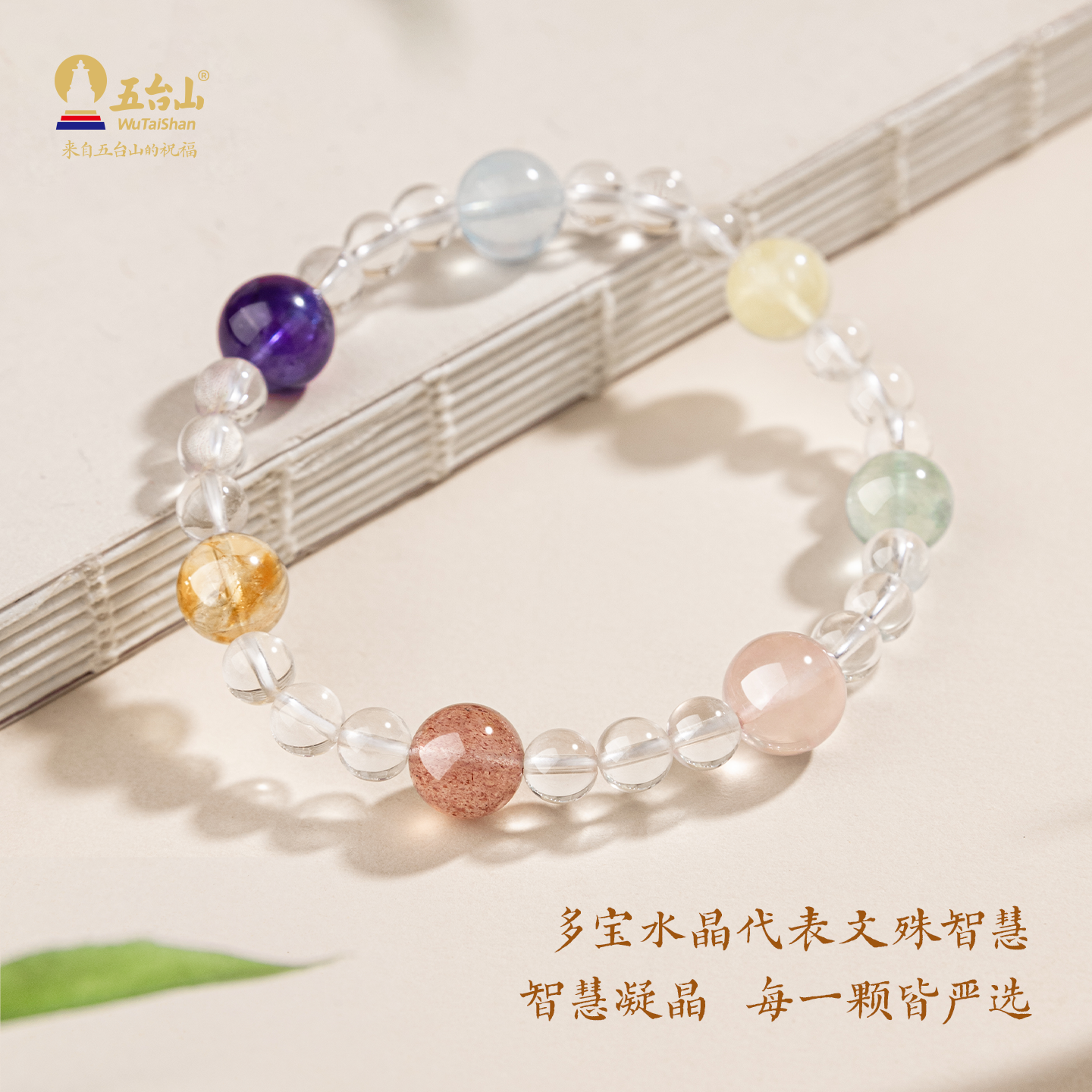 五台山天然白水晶多宝手串女文殊智慧七宝轮海蓝宝粉水晶上岸手链