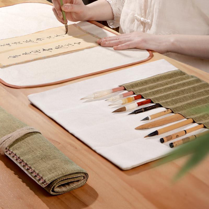 粗布棉麻文房收纳袋便携随行袋复古文艺简约大容量多功能毛笔专用书法国画写生用简约卷笔文具袋布艺笔帘笔卷