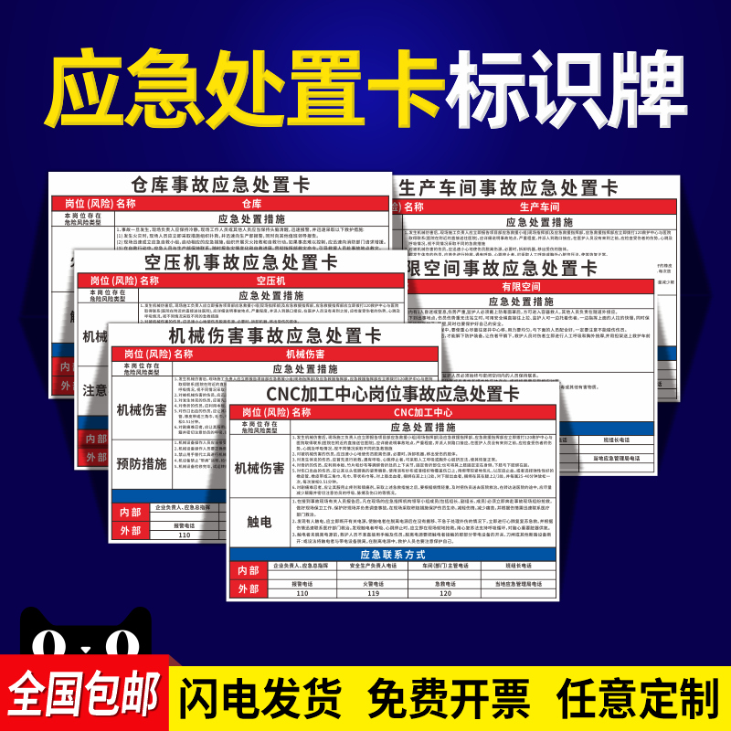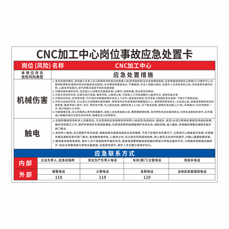 事故应急处置卡空压机危险化学品泄漏火灾触电有限空间应急处置标识CNC生产车间机械伤害提示警示标识标志牌