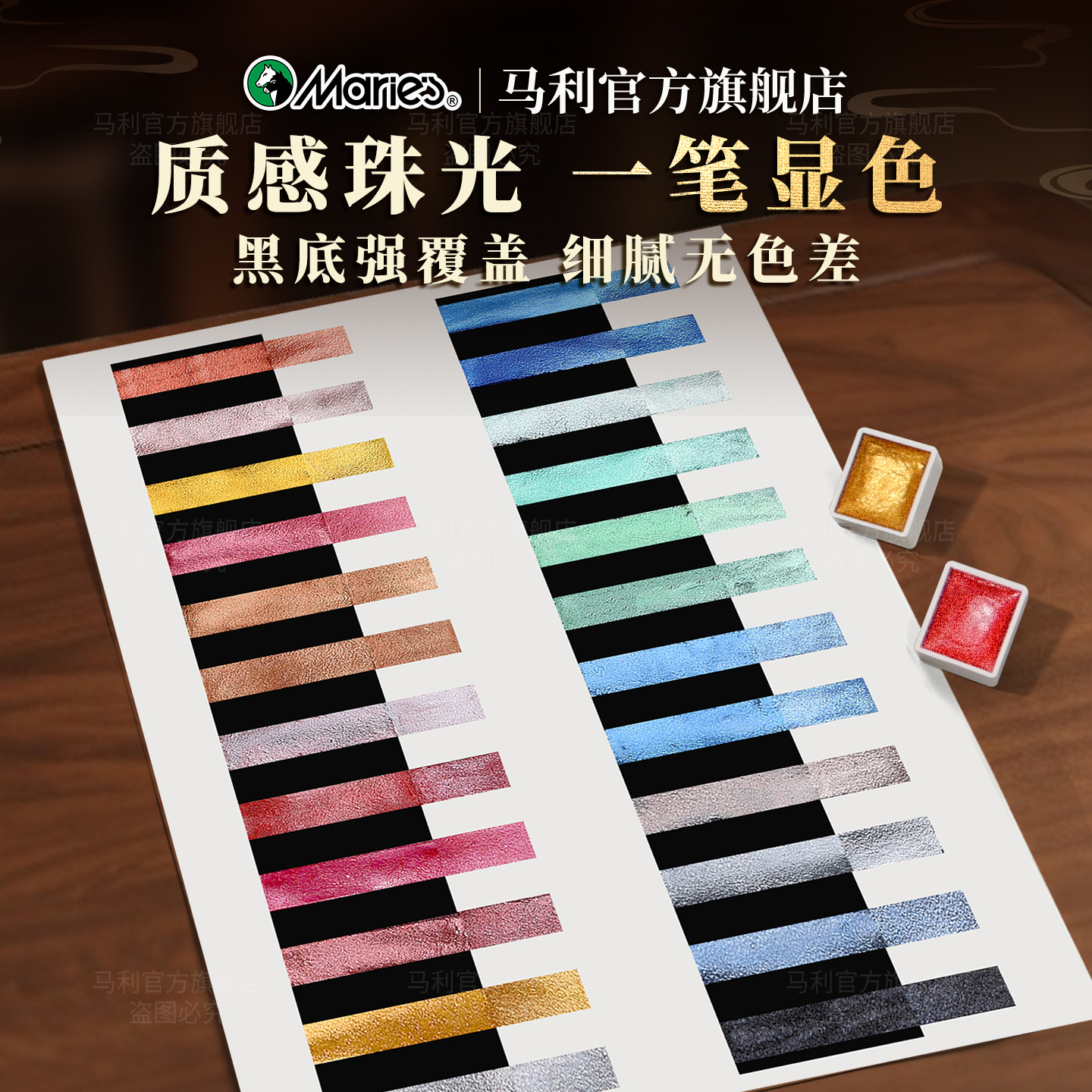 马利珠光国画颜料固体中国画24色敦煌美术生用品工具全套装初学者描金水彩山水画工笔唐卡绘画珠光颜料矿物质