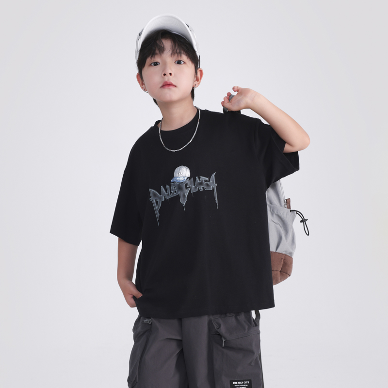 男童夏季潮牌纯棉短袖黑T恤2025新款青少年儿童夏装宽松冰感上衣