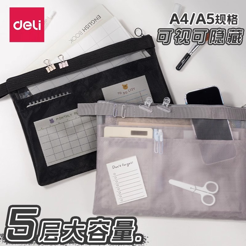 得力A4透明多层文件袋多隔层拉链袋大容量网纱袋办公资料袋a5加厚分层多功能收纳5层孕检学生试卷作业拎书袋