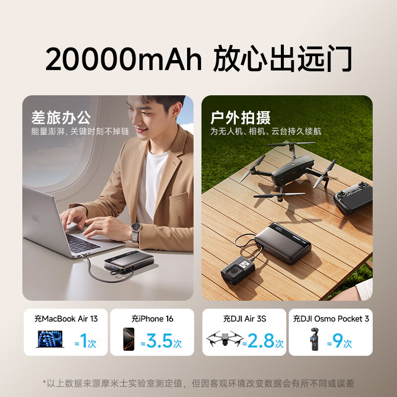【充电宝3C认证可上飞机】绿联2025新款充电宝20000毫安自带线适用苹果17小米快充大容量移动电源官方旗舰店
