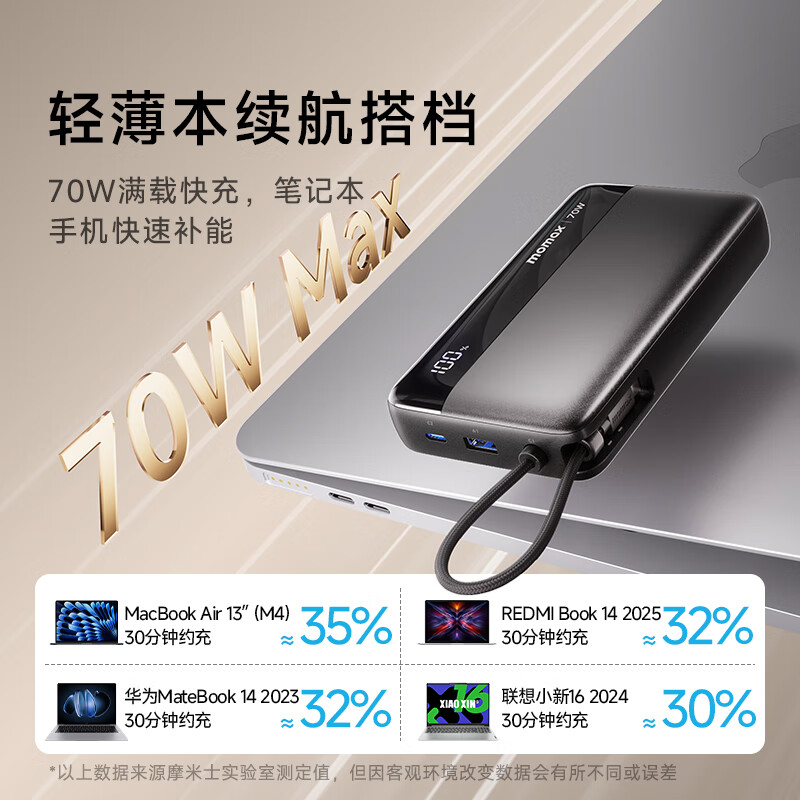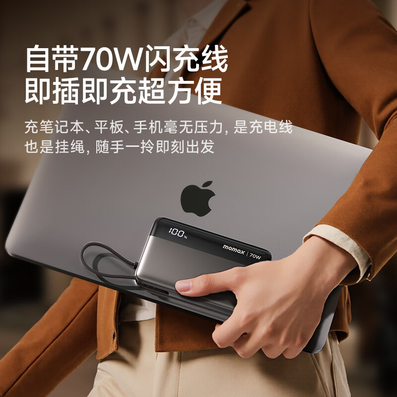 【国家3C认证】MOMAX摩米士70W自带线充电宝20000毫安多口快充PD超大容量便携移动电源适用华为苹果17笔记本