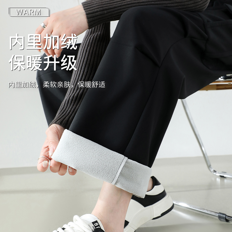 MissWiss收腹直筒裤子女冬季高腰长裤加绒保暖黑色垂感保暖阔腿裤