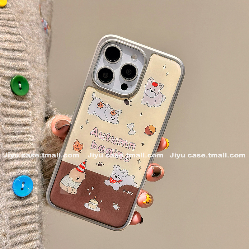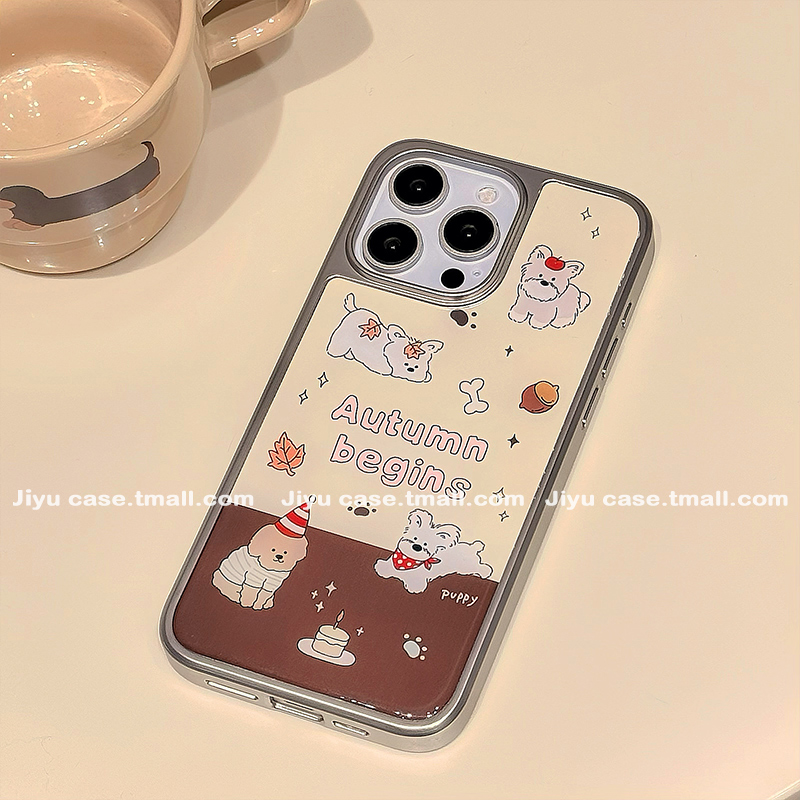 趣味可爱卡通枫叶小狗适用苹果16promax手机壳iPhone15新款电镀14pm秋冬13高级感16小众女15pro韩风16pro全包