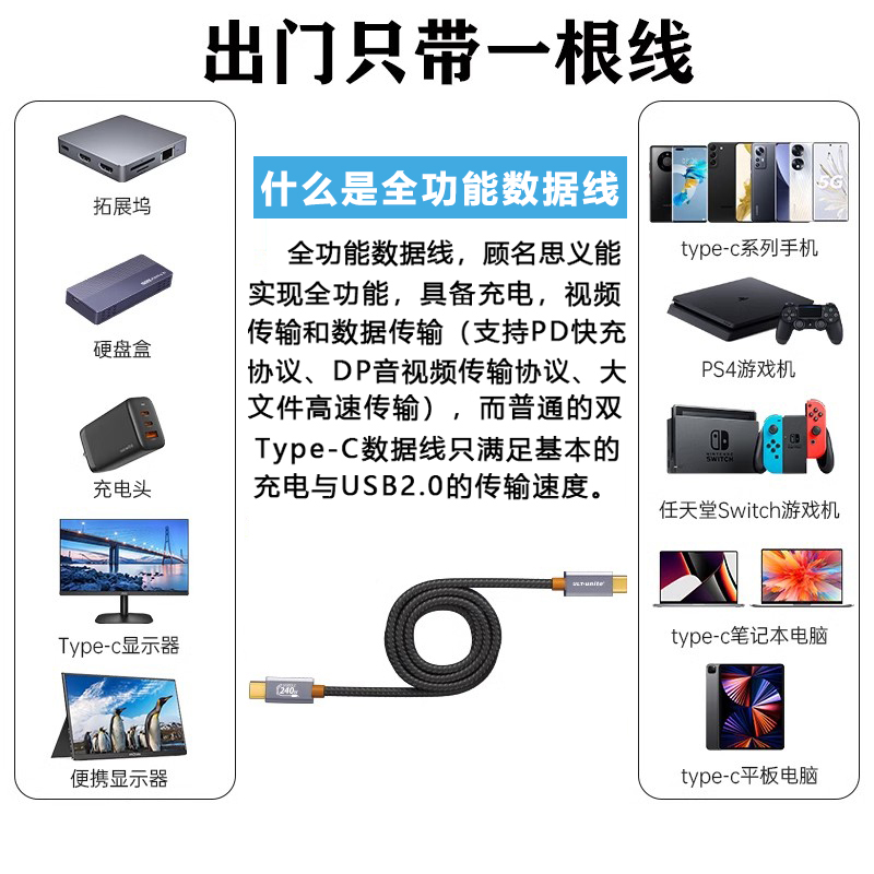 ULT-unite全功能双头typec数据线USB3.1gen2公对公4k投屏快充电PD240W适用苹果iphone15/16promax手机笔记本