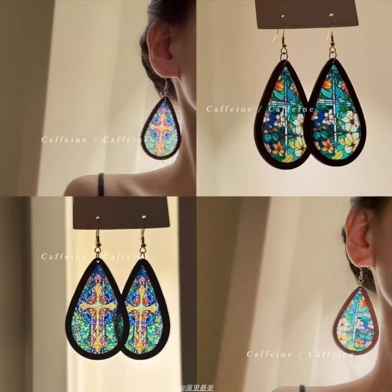 当光经过花窗~巴洛克复古木质亚克力水滴教堂印花耳环耳饰耳钉女