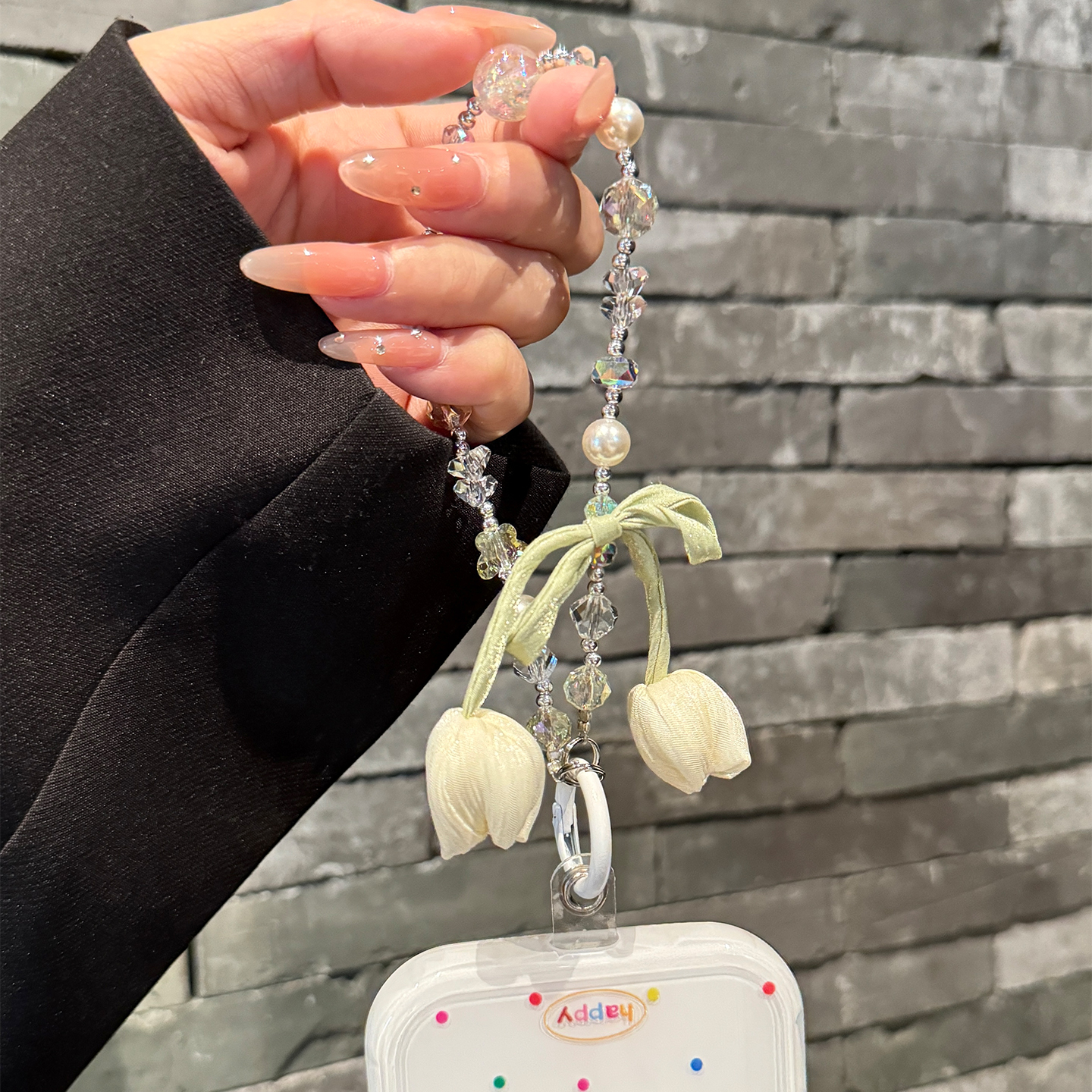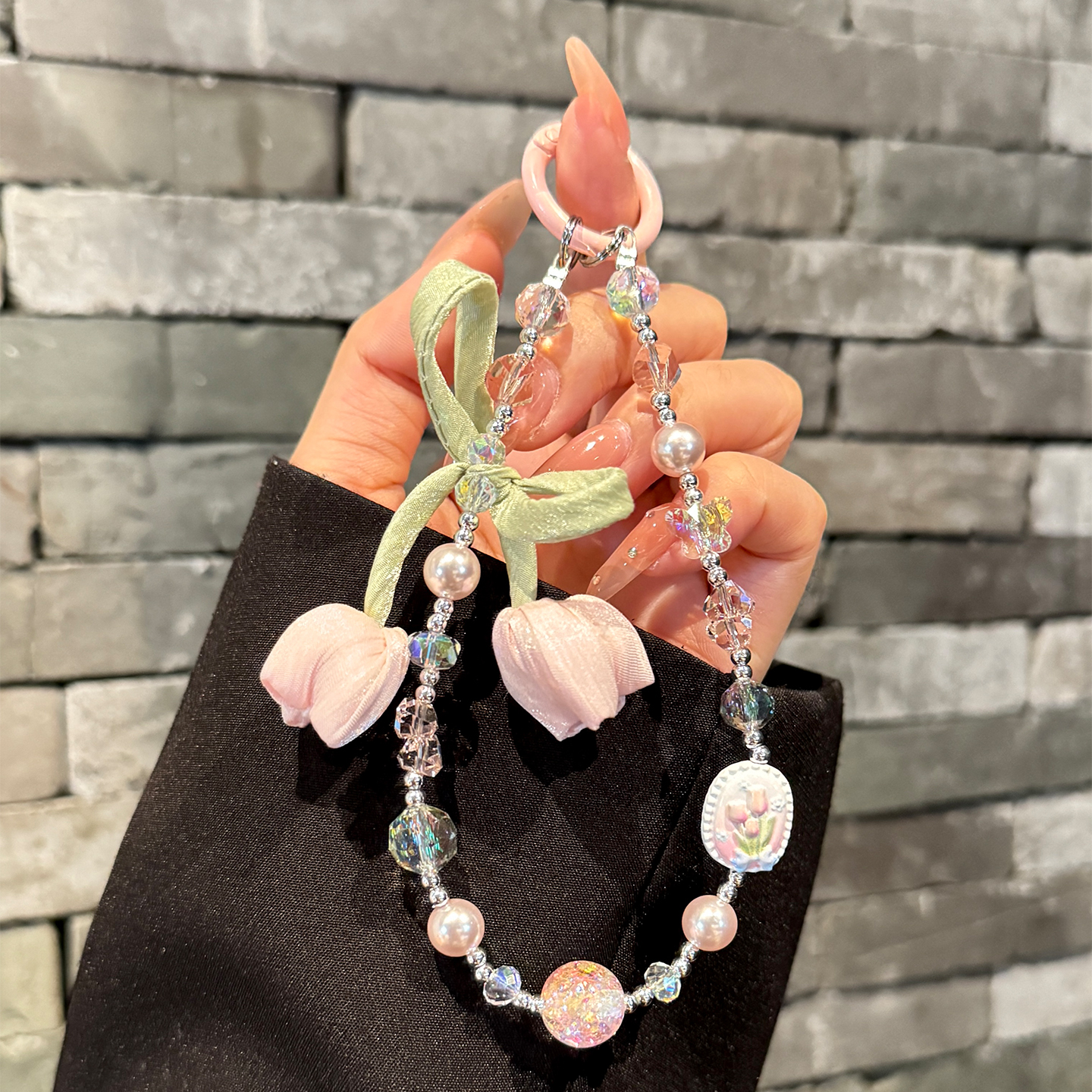 新款粉色郁金香手机链挂饰手腕链条手机挂绳女精致高级感珍珠水晶串珠挂链防丢腕带手机壳包包钥匙挂件超好看