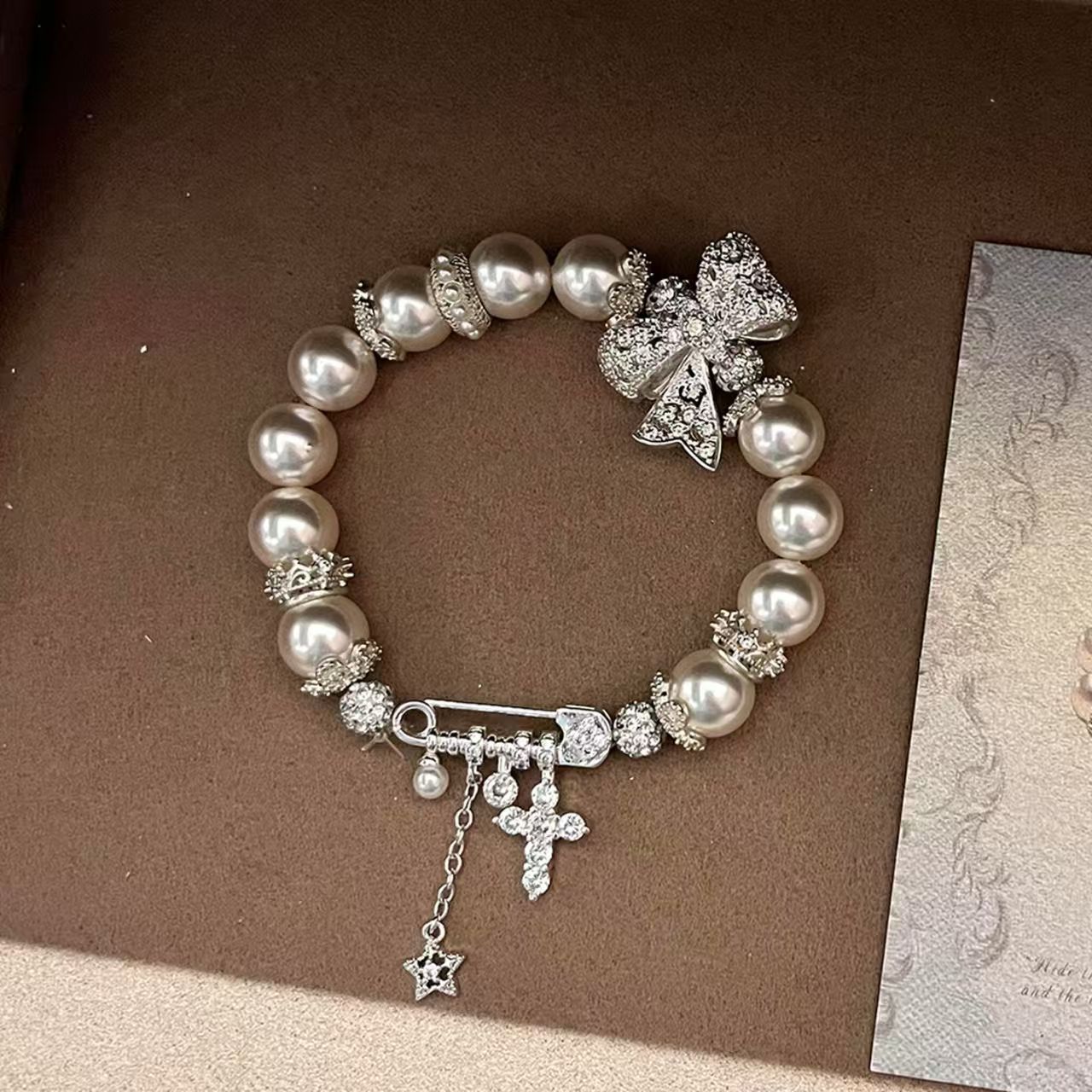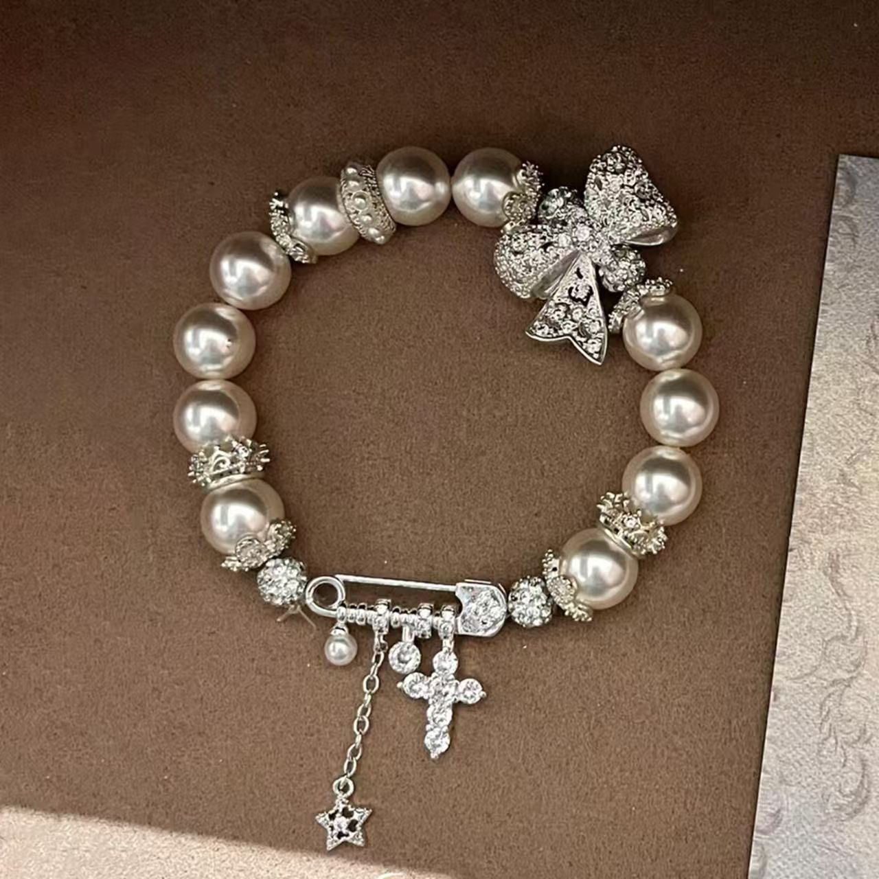 法式珍珠满钻蝴蝶结串珠手链别针流苏千金感甜美气质重工爆闪手饰