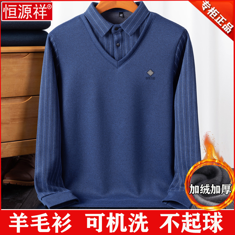 恒源祥纯羊绒衫男士中老年假两件羊毛衬衫领加绒加厚保暖爸爸毛衣