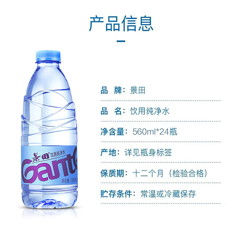 景田饮用纯净水560ml*24瓶整箱包邮小瓶装水非矿泉水