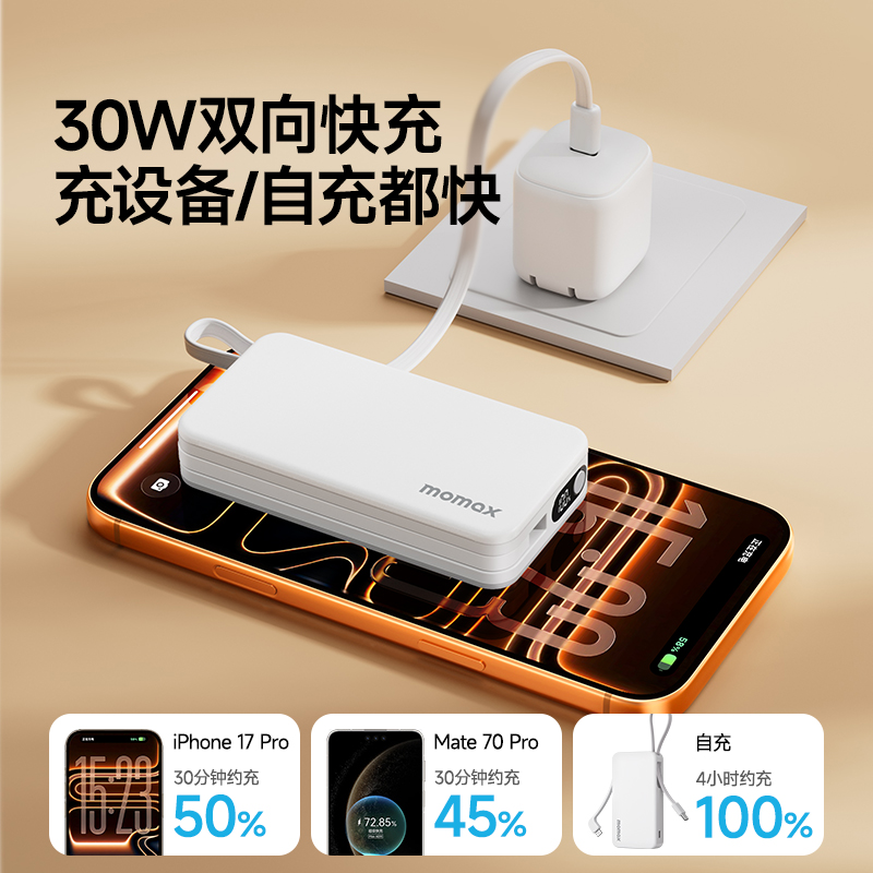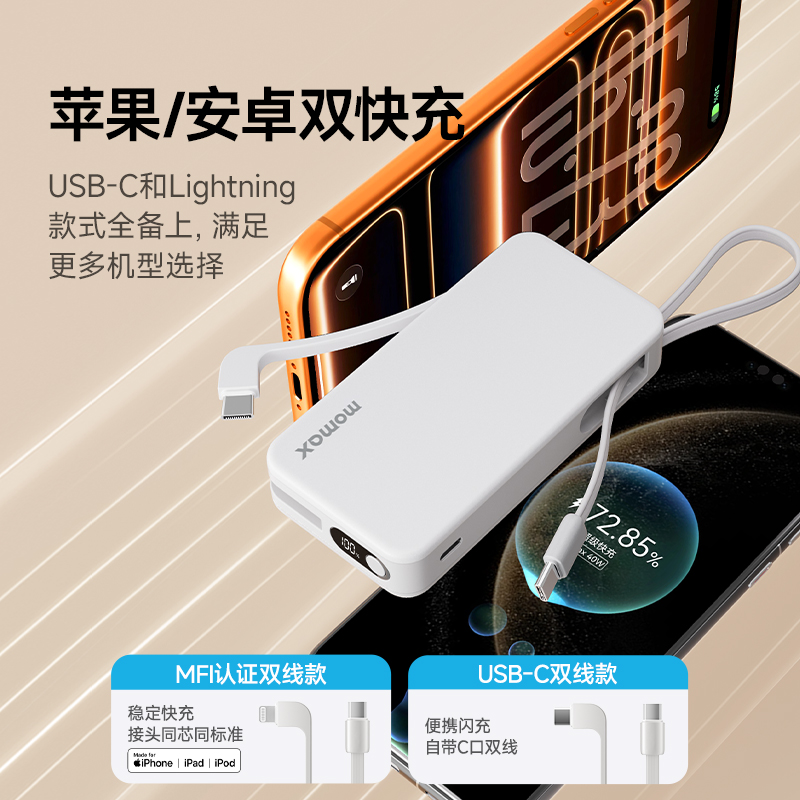 【3C认证可上飞机】MOMAX摩米士2025新款自带双线充电宝快充10000毫安MFI大容量30W快充适用苹果17iphone16