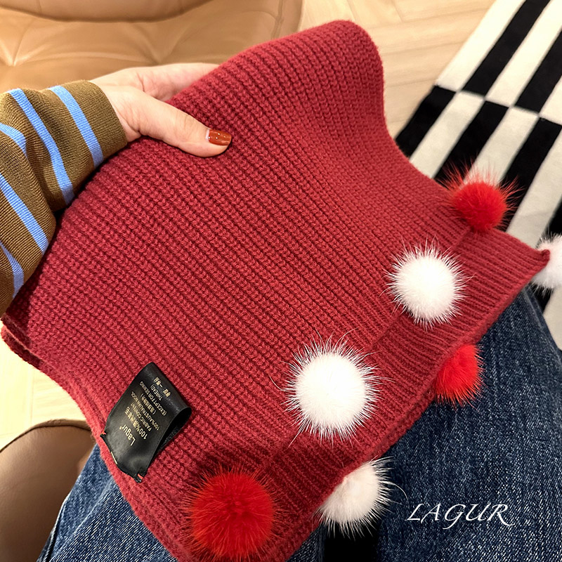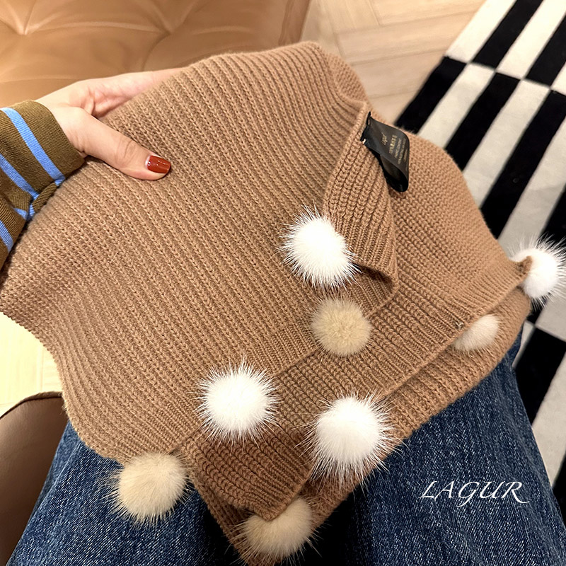 拾旧系列-100%美利奴羊毛复古粗针加厚保暖围巾毛球球围脖冬季女