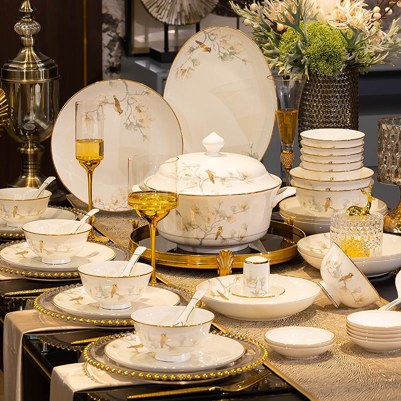 景德镇高档碗碟套装家用现代简约56头骨瓷高脚碗盘子组合餐具套装