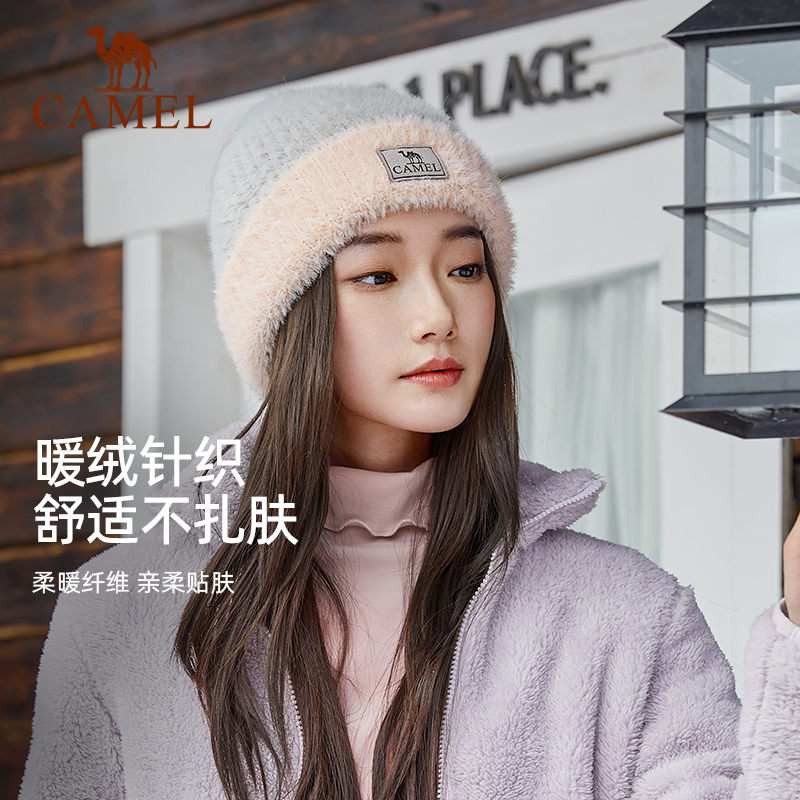骆驼仿貂毛拼色针织帽2025新款秋冬季女保暖防风护耳大头围毛线帽
