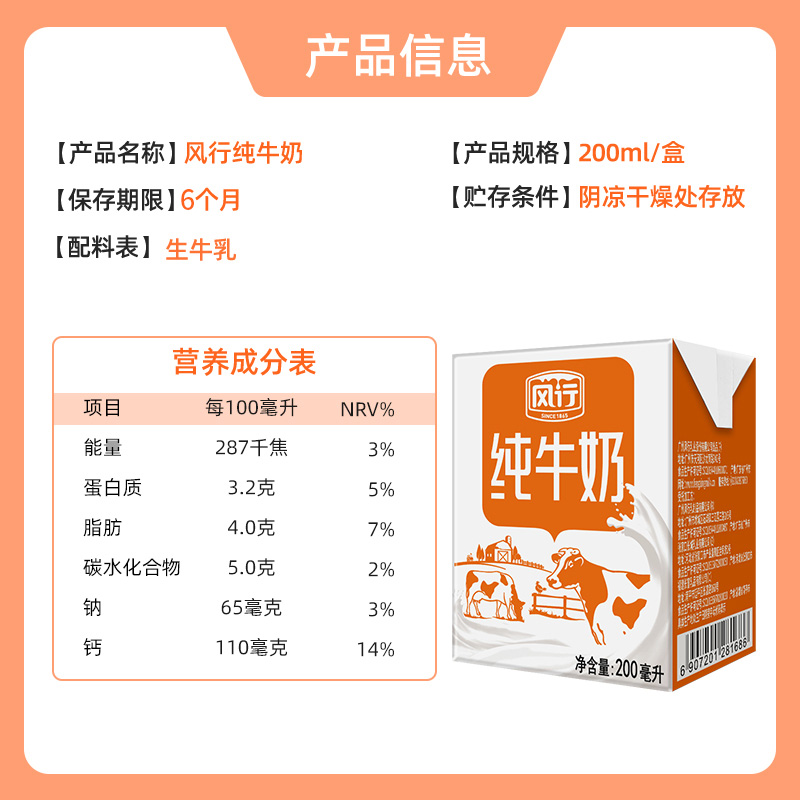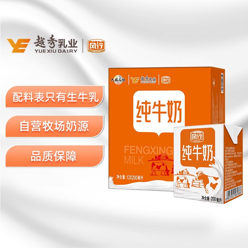 风行牛奶纯牛奶200ml*12盒儿童成长学生奶纯奶整箱饮用乳业越秀