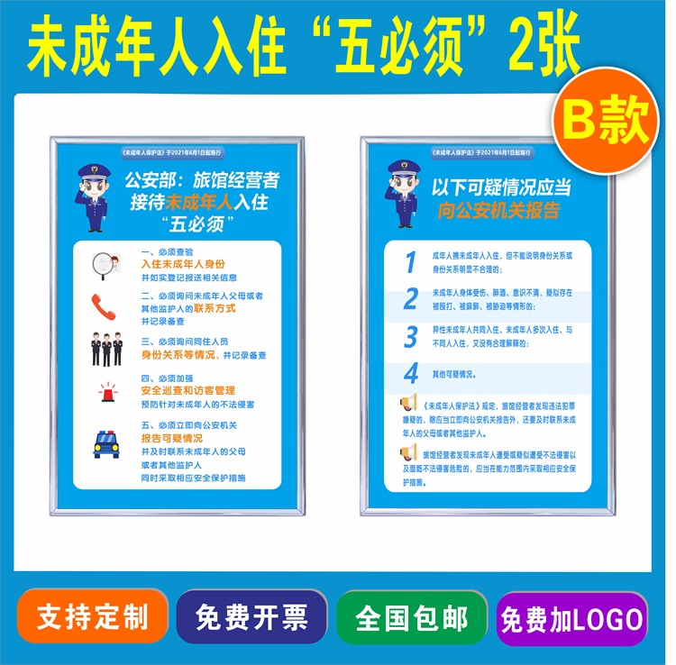 旅馆宾馆酒店经营者接待未成年人入住“五必须”警示制度牌标识牌