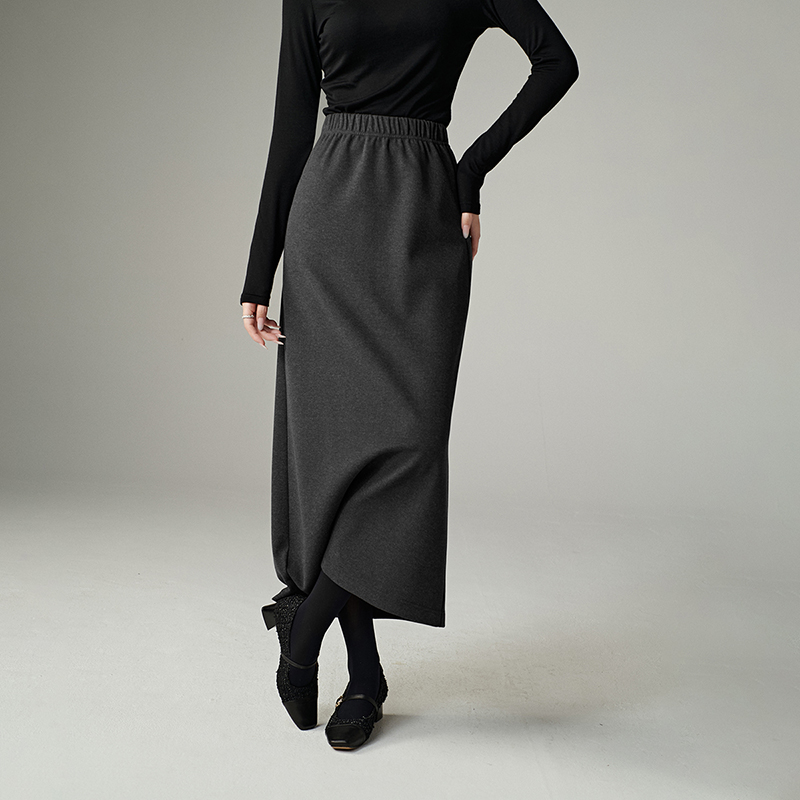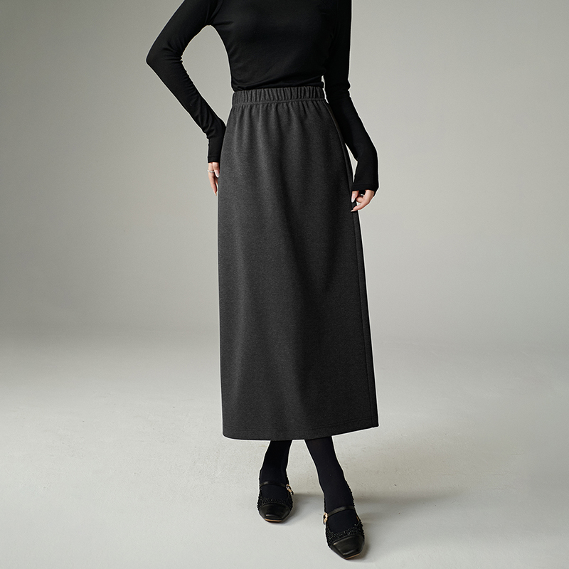 晚白2025年冬新款时尚简约半裙全松紧厚毛呢后开叉直筒长半身裙