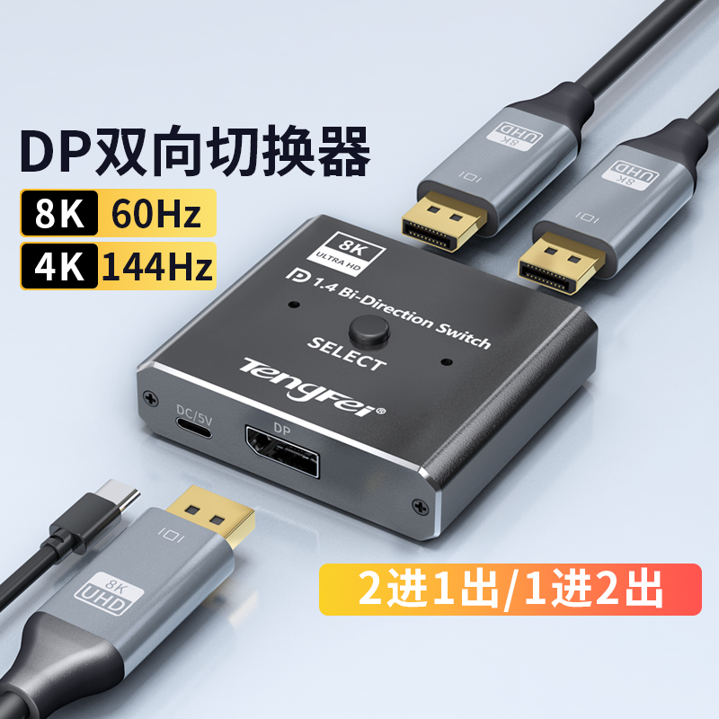 腾飞 DP一分二切换器二进一出4K/144hz电脑主机屏幕4k高清视频分线器二合一拖二2进1出双向显示分屏分配器