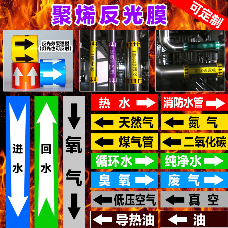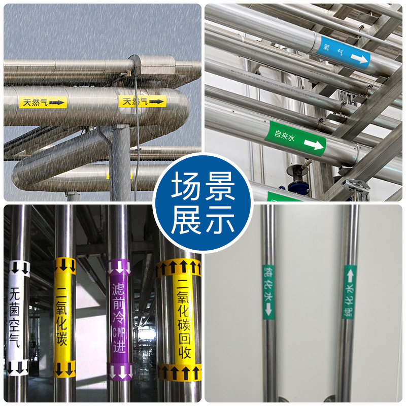 管道标识流向箭头标识牌消防工业标签压缩空气色环警示天燃气标志桩贴纸工厂氧气蒸汽自来水进回反光膜贴纸