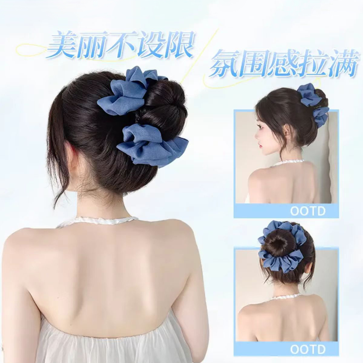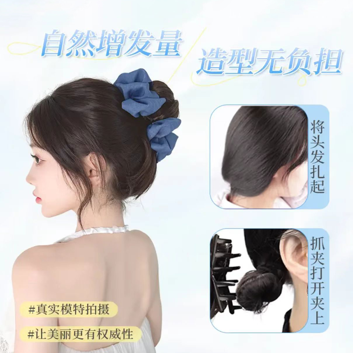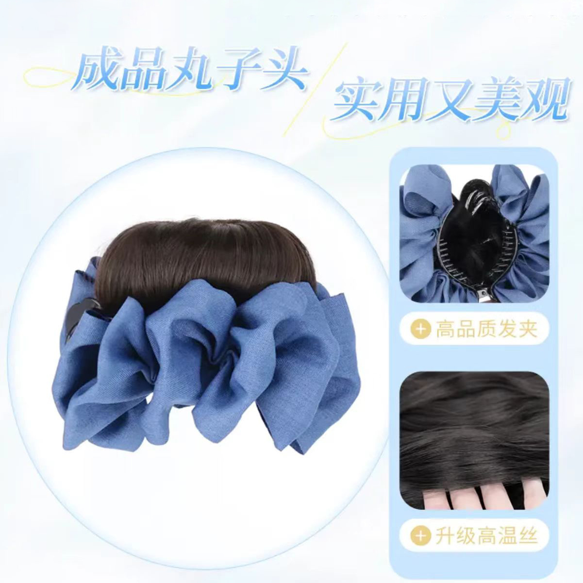 抓夹丸子头发圈增发花苞丸子夹蓝色量懒人盘发神器牛仔丸子头假发