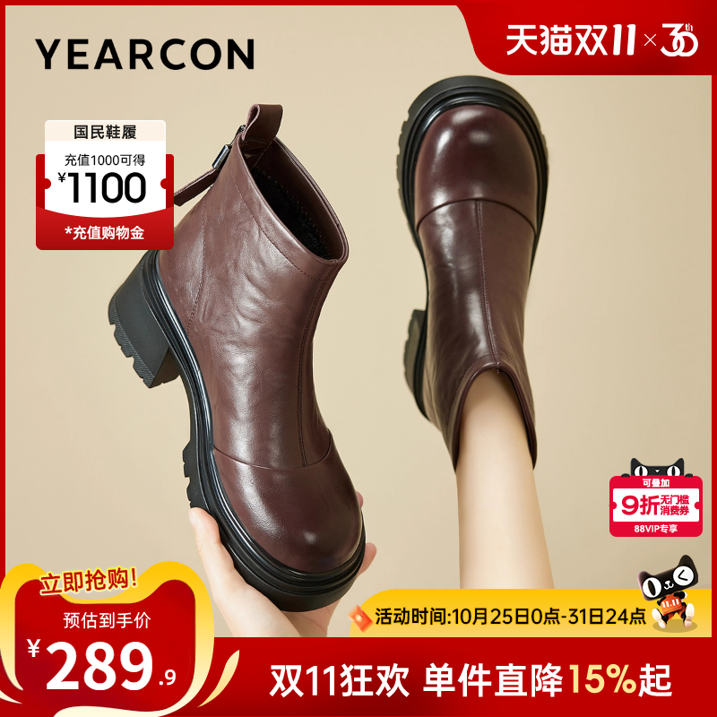 意尔康女鞋冬季真皮加绒短靴粗跟气质厚底显瘦复古及踝靴女士皮鞋