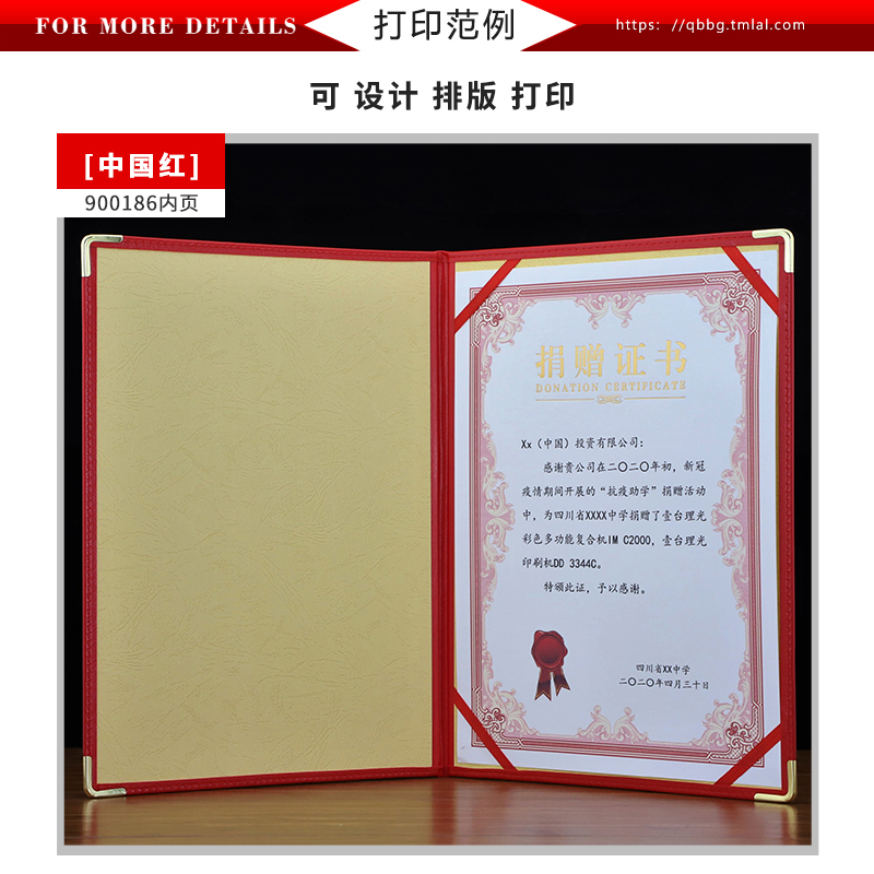 启恒A4捐赠证书红十字会捐赠证明书感谢捐款爱心证书公益表彰奖状荣誉证书封面外壳定做定订制制作皮革面皮面