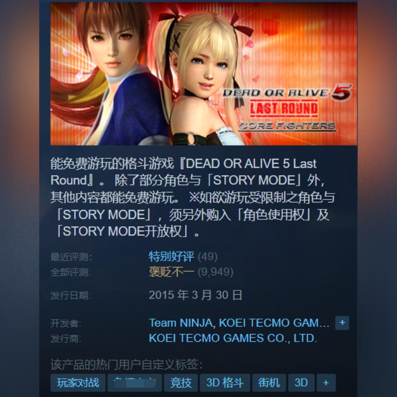 Steam正版 死或生5最后一战 DEAD OR ALIVE 5 国区激活码 CDK