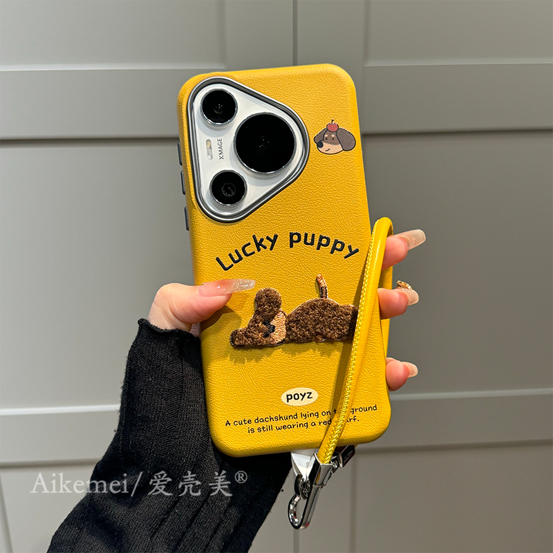 适用华为mate60pro+手机壳秋冬皮纹姜黄底刺绣毛呢泰迪狗狗mate70pro+耐脏皮质p60pro挂绳pura70pro+防摔女款