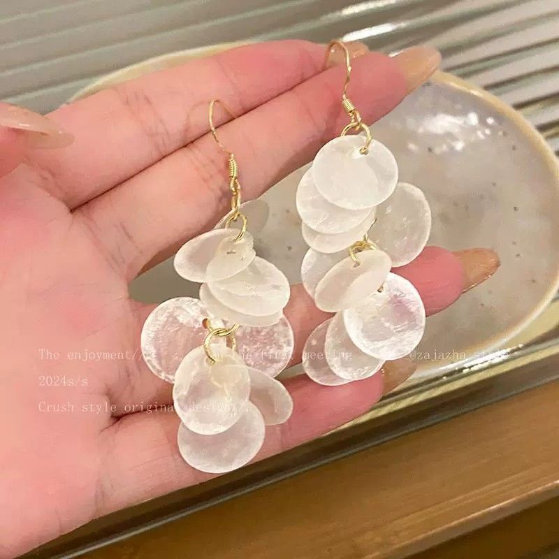 新款鱼鳞贝壳耳环流苏耳饰长款垂坠感设计小众耳坠高级爆款花瓣