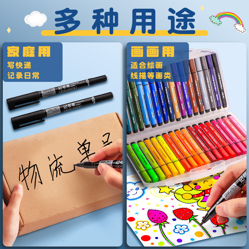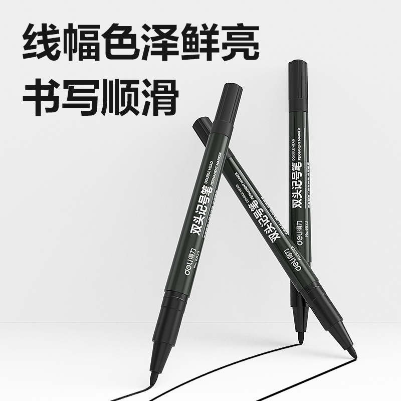 得力小双头记号笔勾线笔美术专用小学生黑色油性细头马克儿童绘画幼儿园描边速干防水防油不易掉色两头