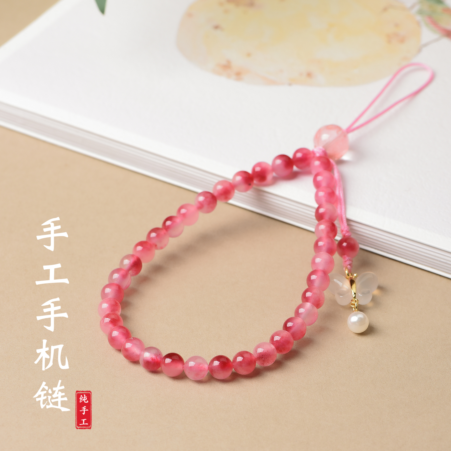 飘花粉玉髓手机链桃粉色串珠女可爱手腕款手机挂件防丢挂饰2025新