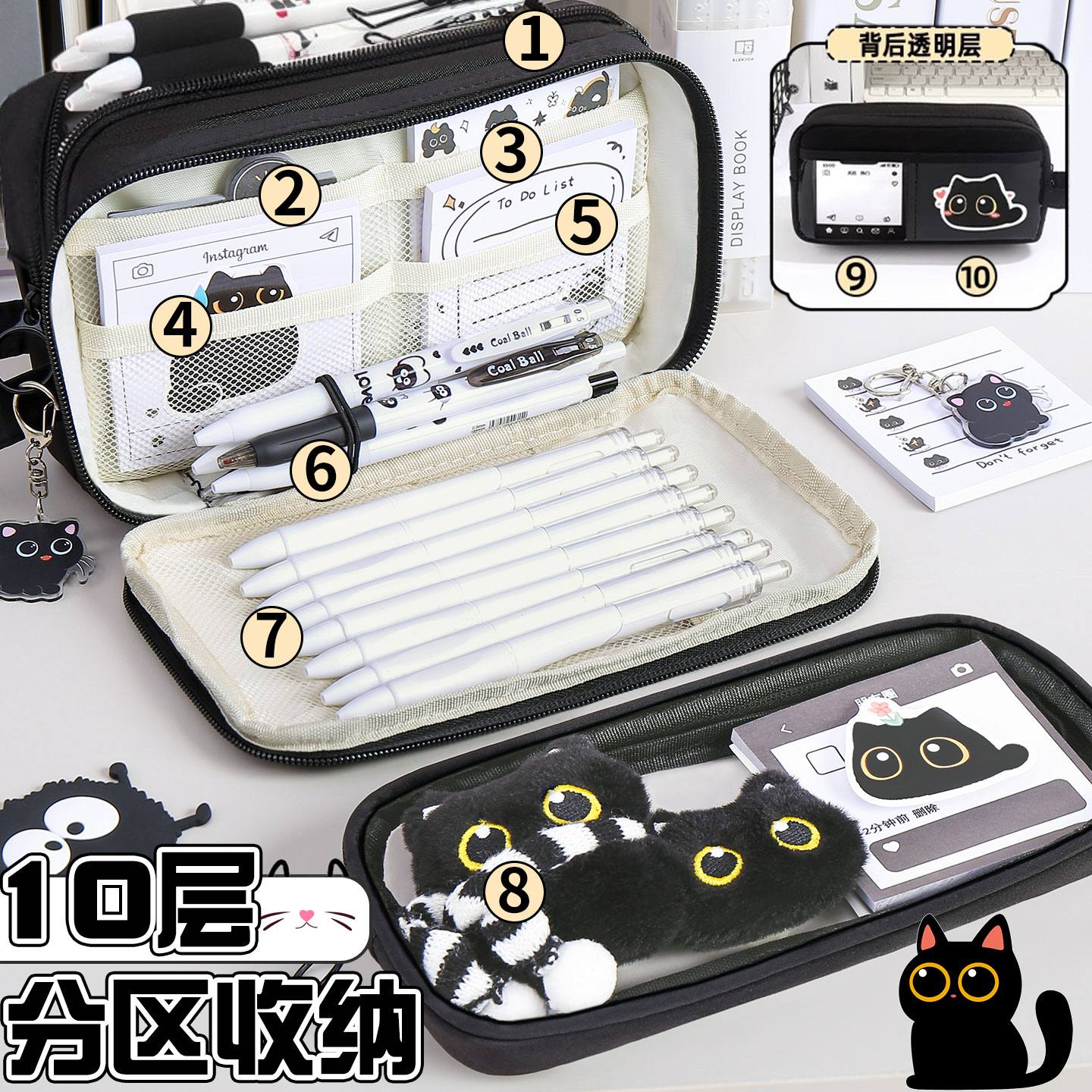 猫咪透明笔袋女生高颜值ins风二合一可拆卸痛包笔袋可放小卡大容量文具盒小学生初中生用简约耐脏铅笔袋