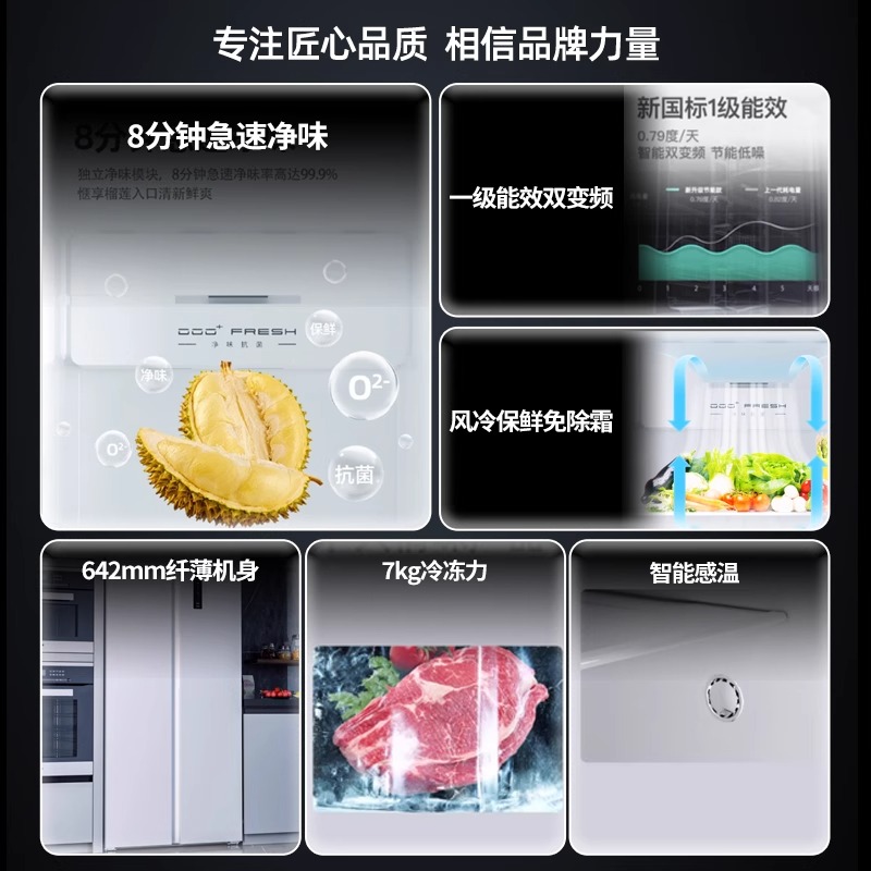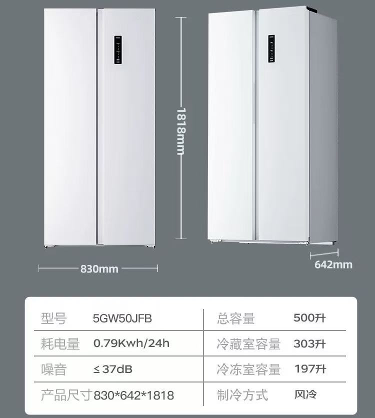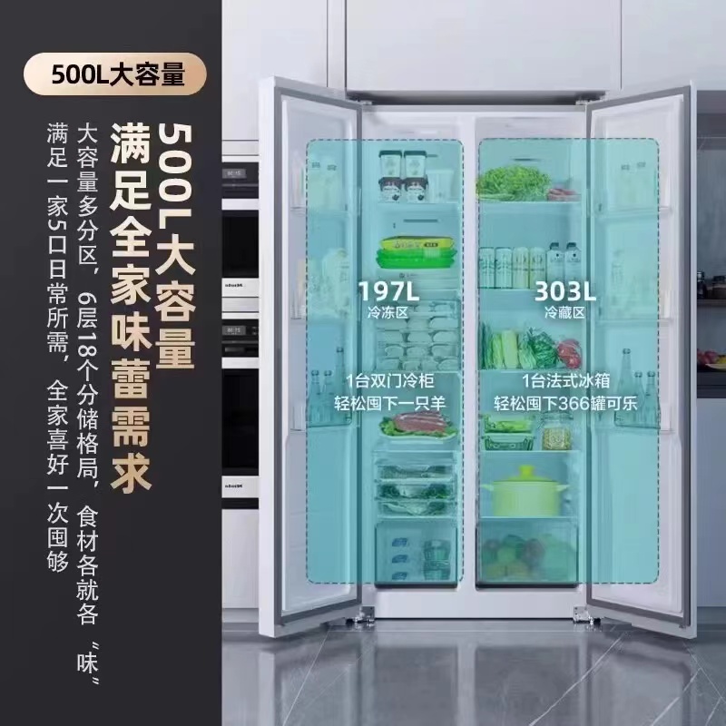 康佳500L电冰箱8分钟净味变频对开双开门风冷白色超薄家用国补贴