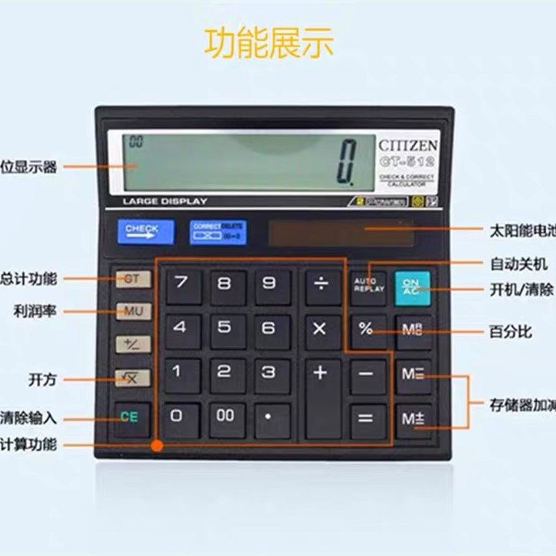 西铁城CT-500计算器双电源太阳能财务会计专用办公用品复查计算机