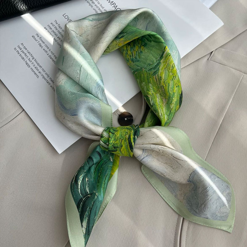 希望的田野油画风绿色100%斜纹绸真丝小方巾女春秋显气质丝巾发带