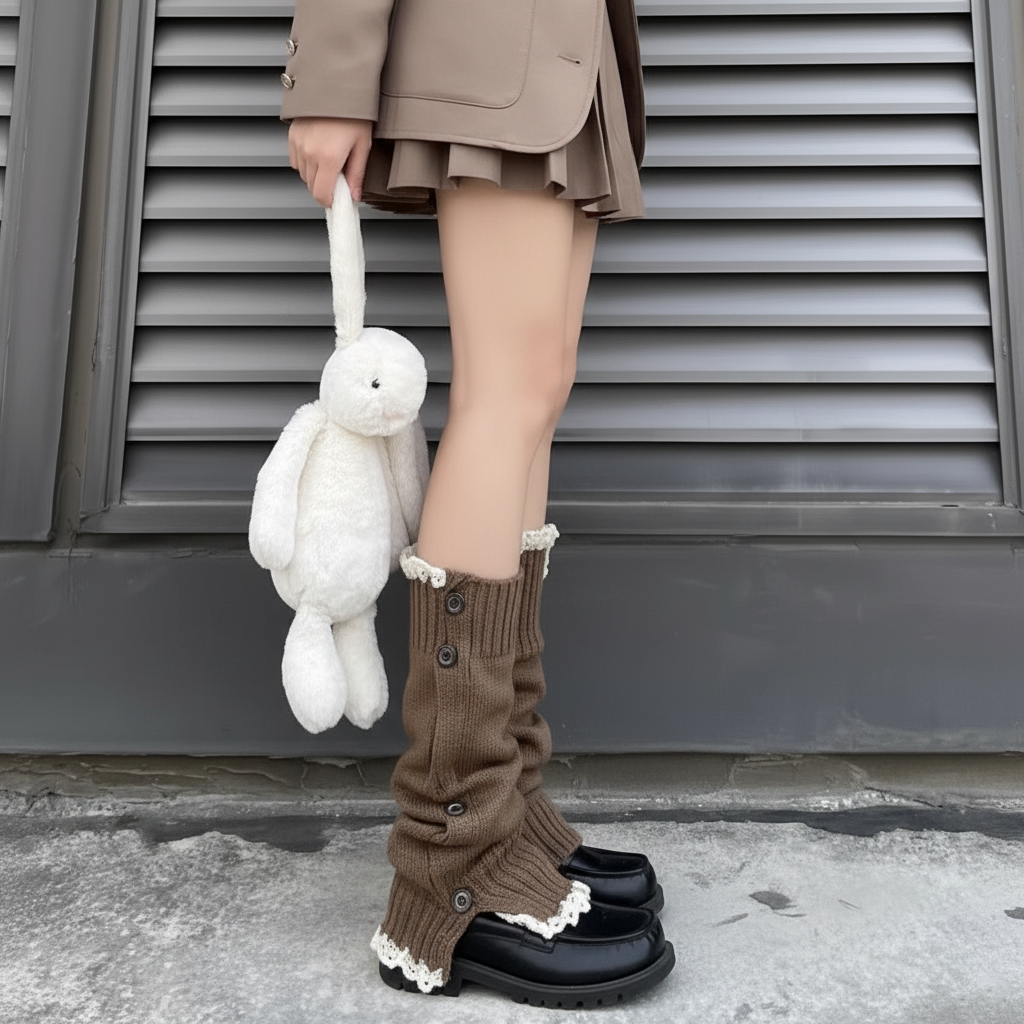 美拉德花边堆堆袜套ins咖色简约y2k显瘦腿袜百搭纽扣纯色秋冬腿套