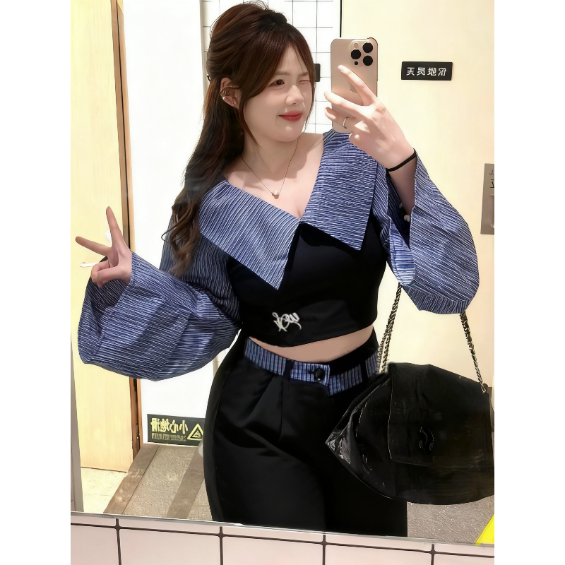 简约撞色设计感一字肩条纹拼接衬衫上衣大码休闲阔腿裤两件套秋季