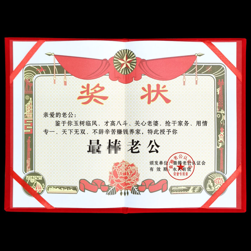定制佳老公奖 送给中国好爸爸证书 好男友荣誉奖状生日 闺蜜证 恶