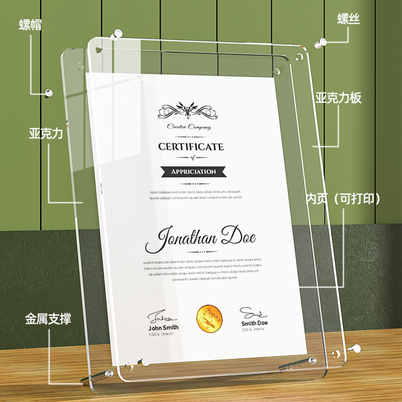 水晶荣誉证书a4奖状优秀员工证件书结业颁奖聘书专利授权书外壳高档亚克力捐赠证书展示框企业证书定做定制
