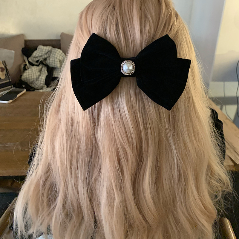 珍珠丝绒蝴蝶结发夹~富家千金风顶夹黑色法式高级感赫本小香发饰