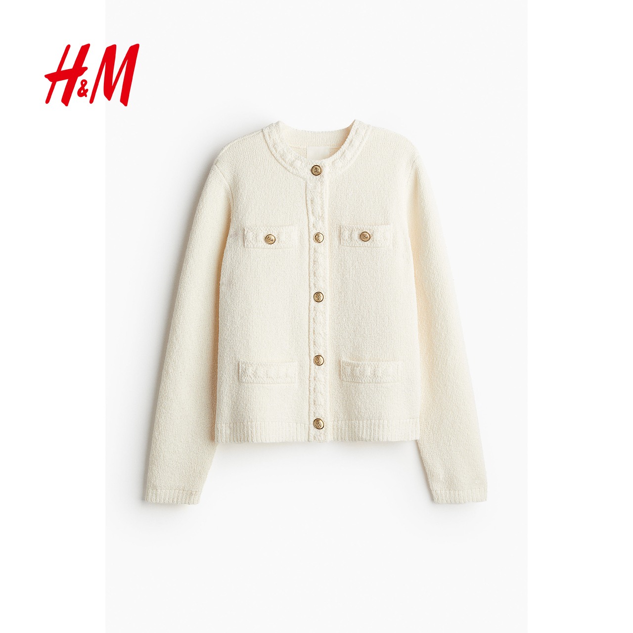 HM女装毛针织衫秋季廓形小香风针织开衫外套慵空调衫上衣1194323