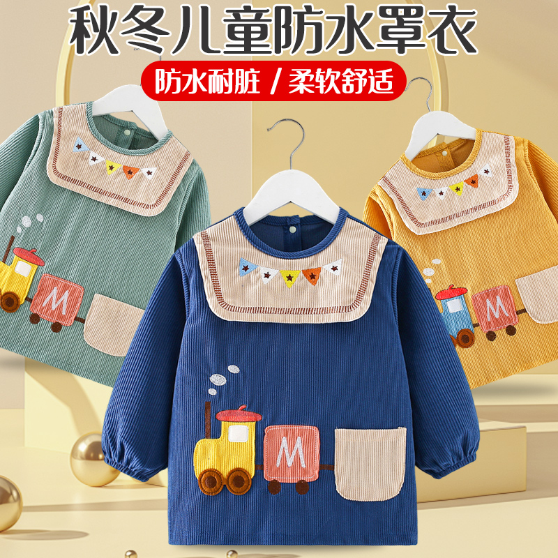 宝宝罩衣秋冬防水灯芯绒儿童长袖吃饭婴儿围兜男童反穿衣防脏外穿