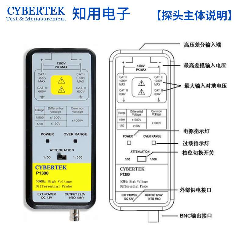 CYBERTEK知用P1300高压差分探头浮地测量功能1300Vpk/50MHz