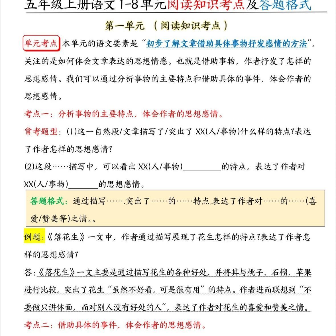 五年级上册语文阅读理解常考题型与答题公式1-8单元课本同步习本