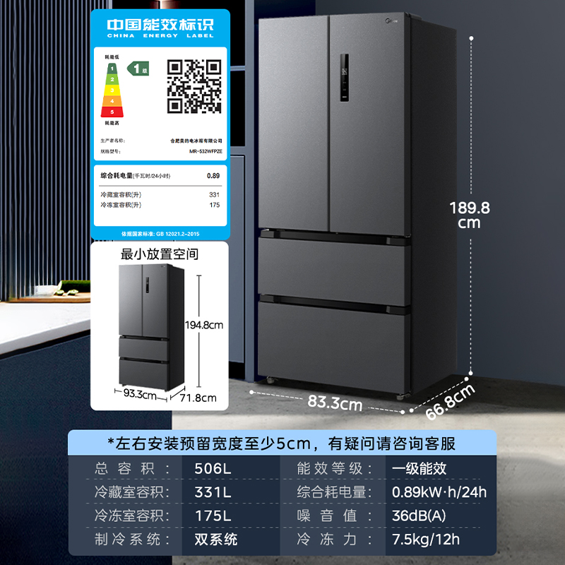 美的508法式双系统多门净味四门双循环无霜一级大容量家用冰箱
